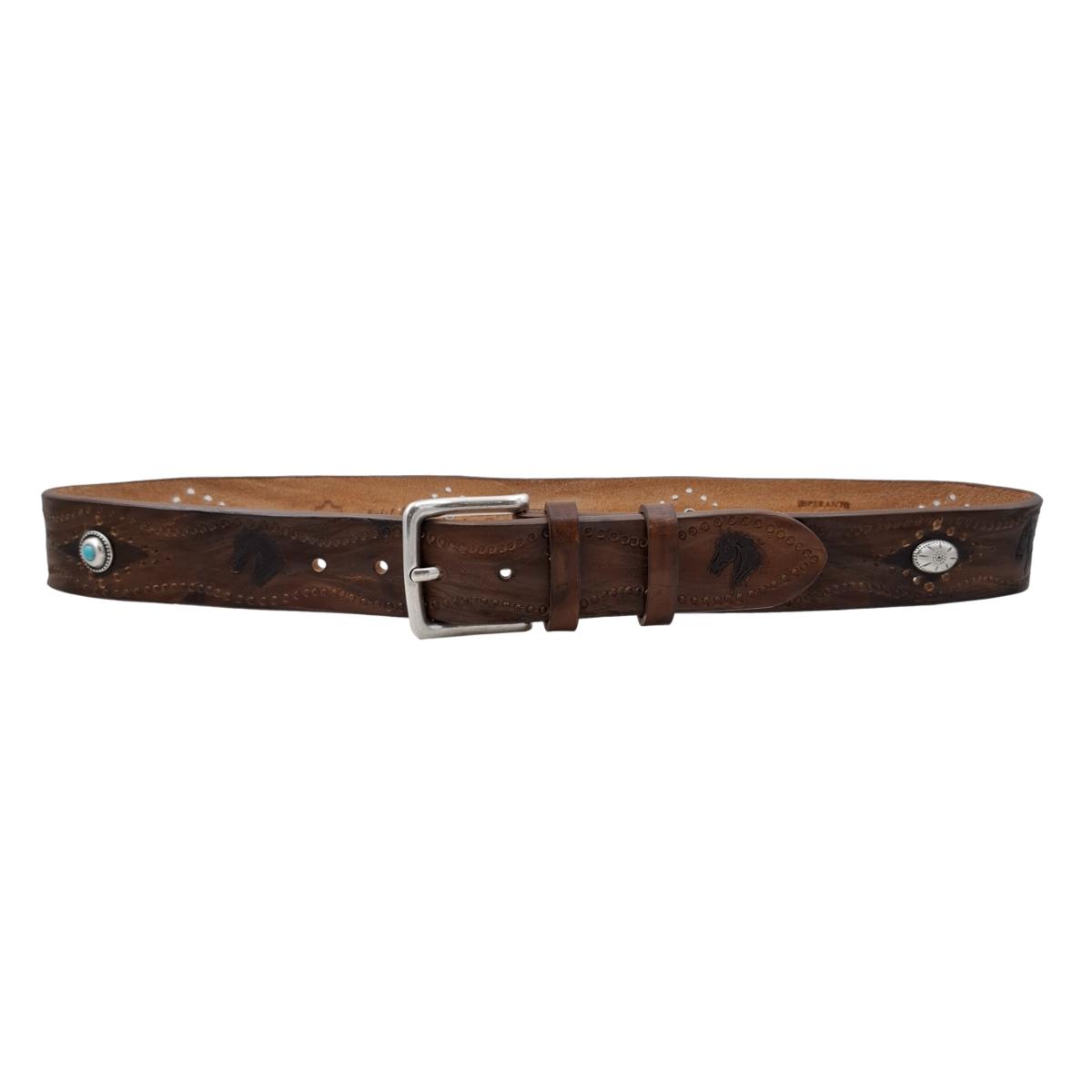 La cintura è caratterizzata da borchie metalliche e con pietre celesti , intervallate da stampe a caldo di cavalli .